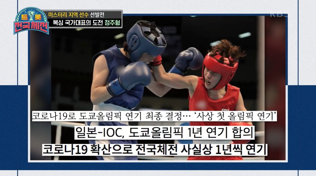 트롯전국체전 미스터리 지역 선발전에 국가대표 복싱 선수 출신이 정주형 참가자가 트로트에 도전을 하였습니다. 전세계적으로 코로나19의 영향으로 복싱 체전이 거의 개최되지 못하고 있는 상황에서 트롯전국체전에 트로트 가수를 도전하기 위해 출전하였다고 합니다.