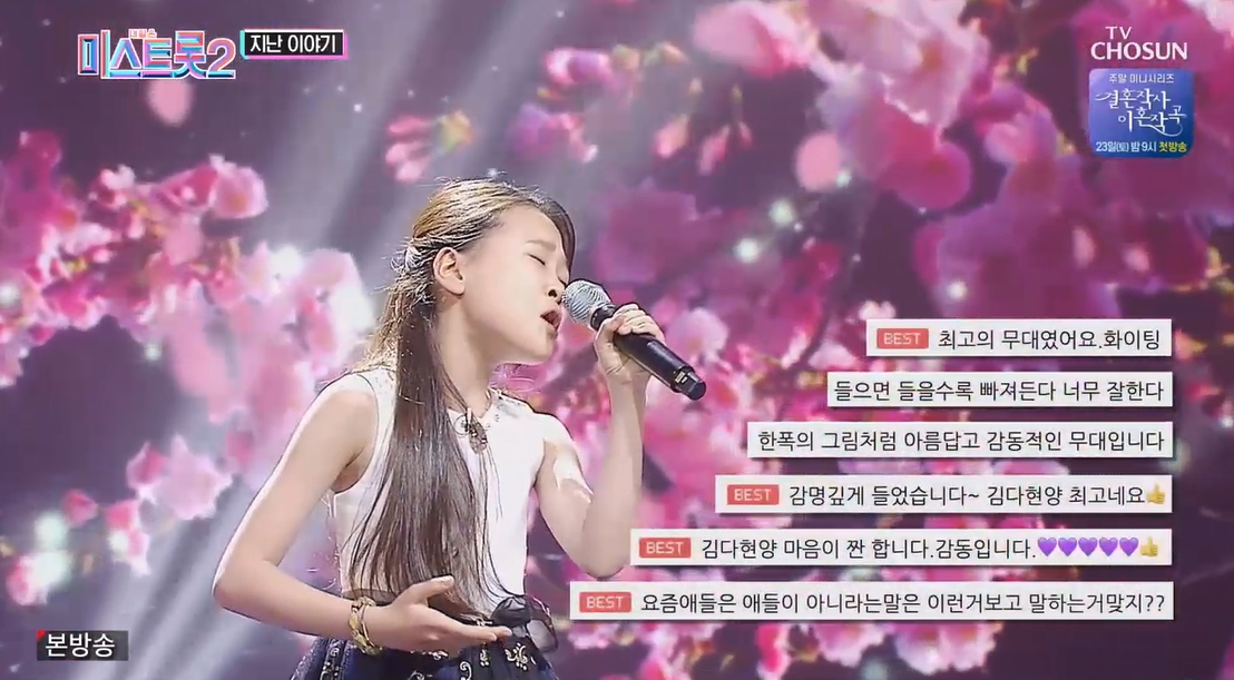 이번 TV조선 미스트롯2 갈라쇼 방송시간은 3월 11일 밤 10시 00분에 방송되며, 미스트롯2 갈라쇼는 미스트롯2 TOP 7인 양지은, 홍지윤, 김다현, 김태연, 별사랑, 김의영, 은가은 결승 진출자 무대와, 준결승에 진출한 7인 강혜연, 황우림 김연지 허찬미 마리아 윤태화 류원정 등 총 14인의 트롯여제들이 꾸미는 미스트롯2 갈라쇼 무대입니다.